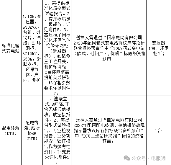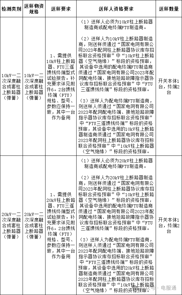 (3)送检的10kV一二次深度融合成套柱上断路器(弹簧)、20kV一二次深度融合成套柱上断路器(弹簧)应按附件6的送样要求在出厂时提前做好准备工作;送检的标准化箱式变电站应按附件7的要求在出厂时提前做好准备工作;送检的配电终端(DTU)应按附件5的要求在出厂时提前做好准备工作。