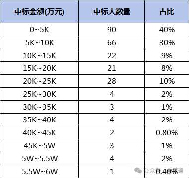中标金额在5000万以下的共计90家,占比40%,中标金额在5-6亿元的5家,占比2.4%(见下表):