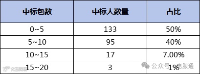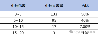 中标包数在5个以下的共计133家,占比50%,中标包数达15-20个的只有3家,占比1%(见下表):