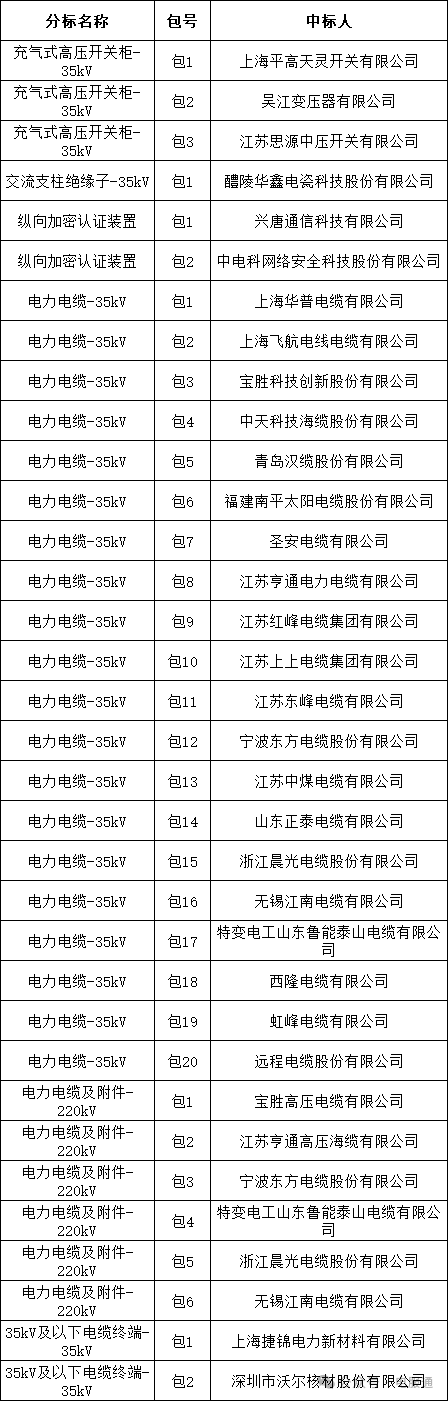 国网上海市电力公司2024年第二次用户接入工程物资协议库存招标采购的中标候选人公示活动已经结束。,现将中标结果公告如下: