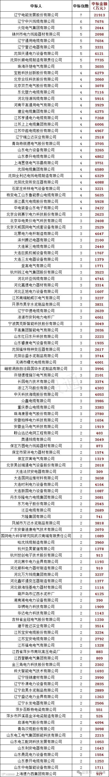 中标排名第一的是:辽宁电能发展股份有限公司中7个标包,中标金额21912万元;