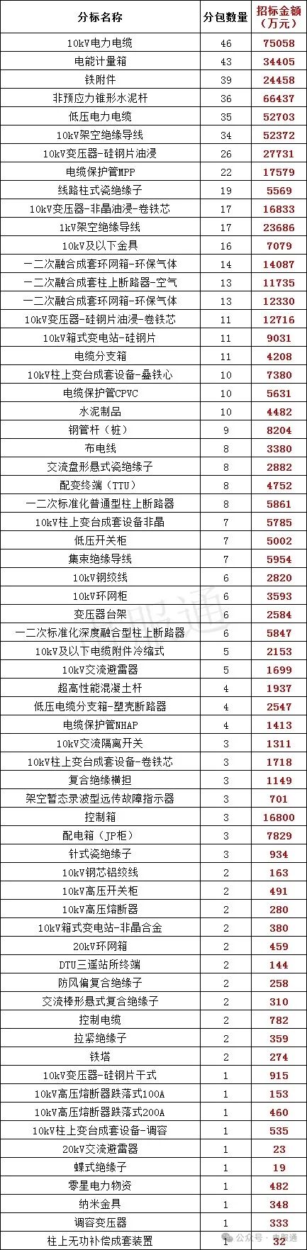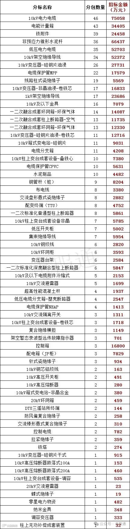 分包数量最多的是:10kV电力电缆46个标包,电能计量箱43个标包,铁附件39个标包,—二次融合套环网箱、—二次融合断路器:各27个标包;