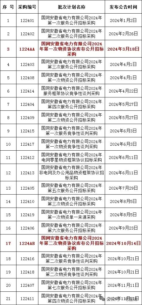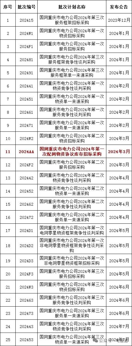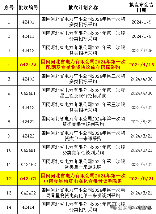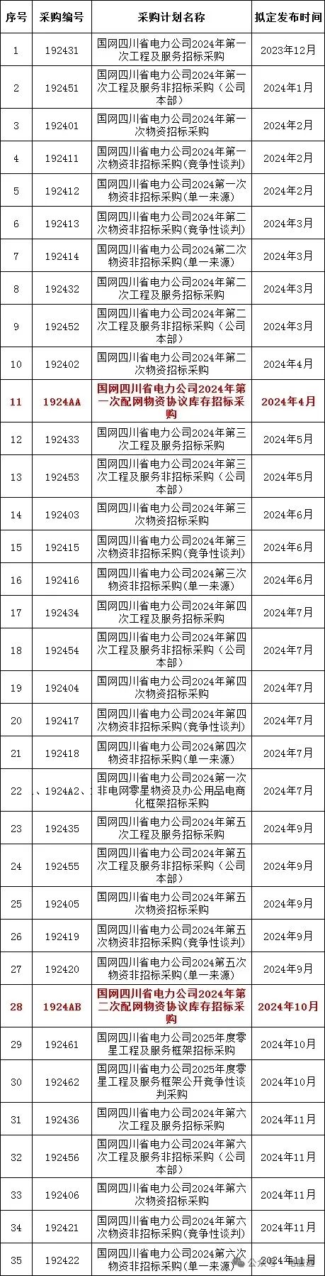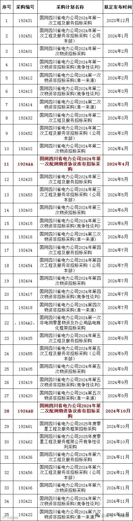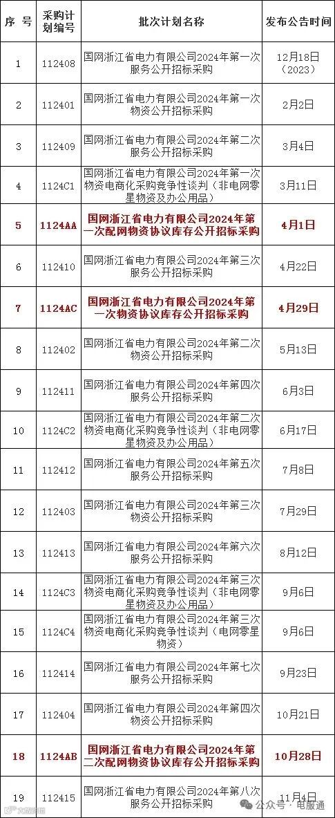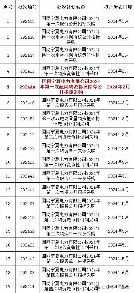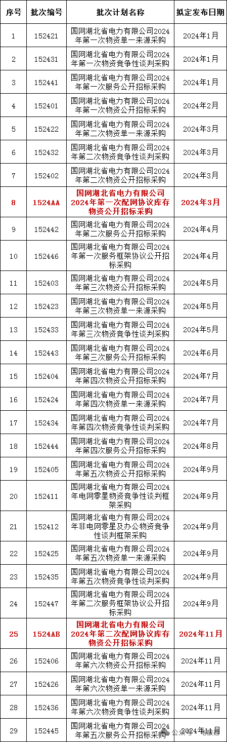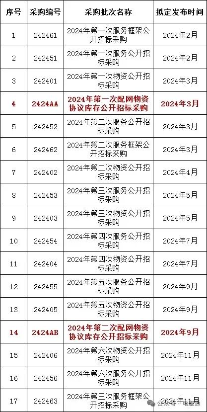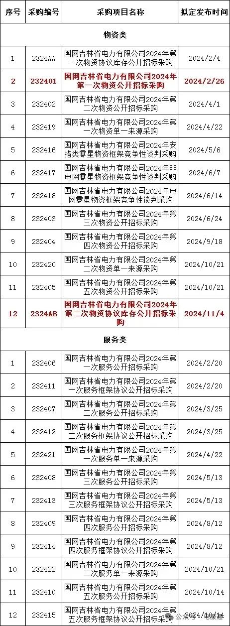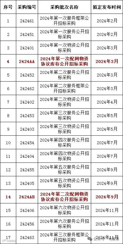 2024年采购批次安排公示