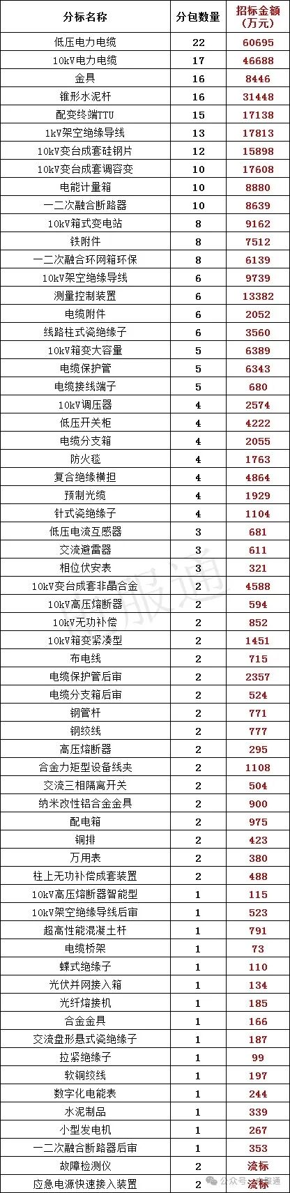 招标金额及分包数量最多的是:低压电力电缆、10kV电力电缆;