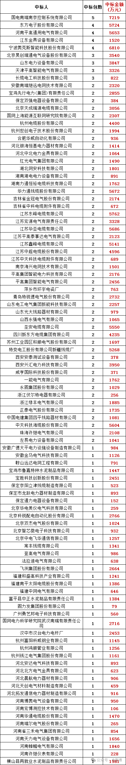 排名第一的是:国电南瑞南京控制系统有限公司中5个标包,中标金额达7219万元;