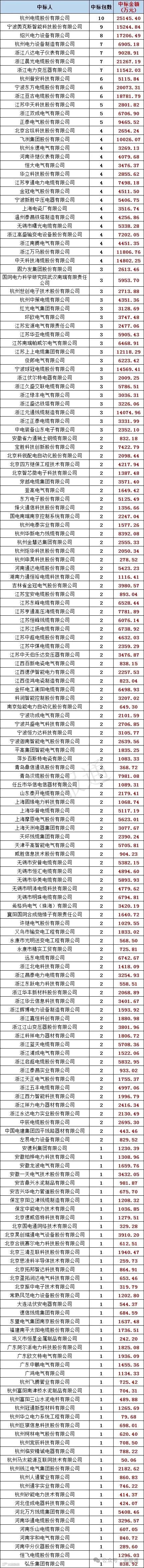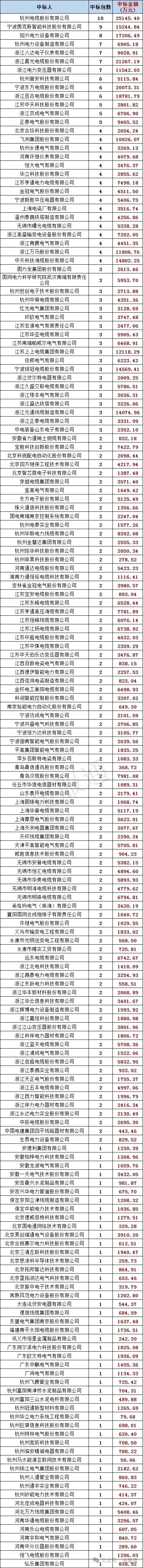杭州电缆股份有限公司:中标金额25145万元,中标包数10个,排名第一;