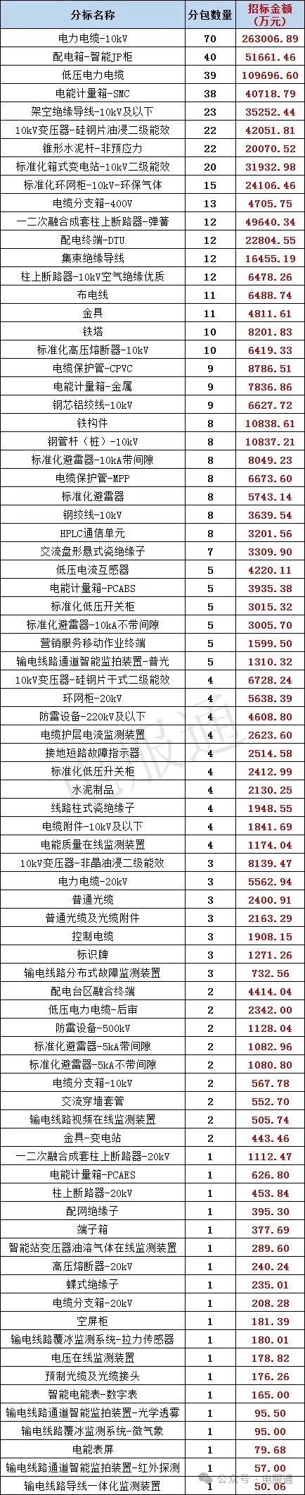 招标金额最多的是:电力电缆263006万元,低压电力电缆109696万元;