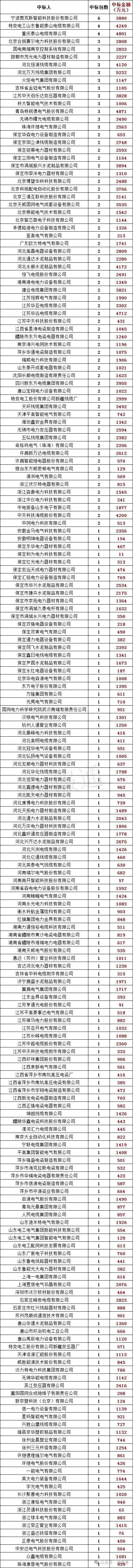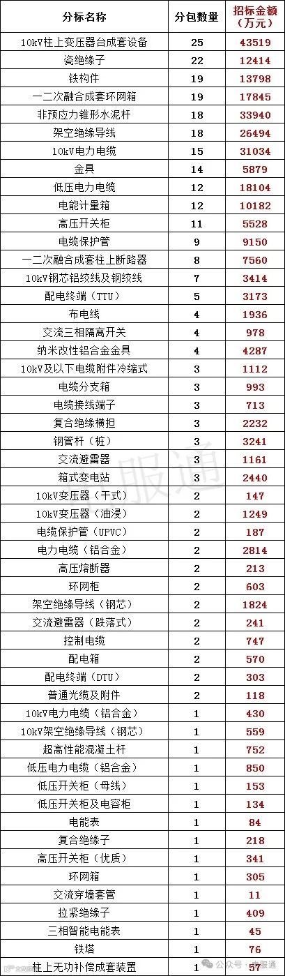 标段排名第一是:10kV柱上变压器台成套设备25个标包,招标金额43519万元;