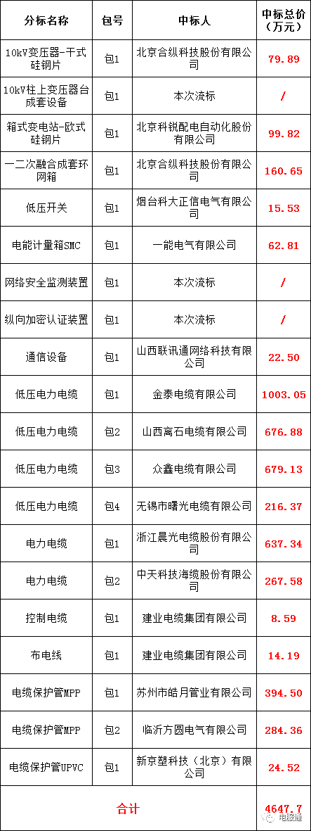 国网山西省电力公司2023年第一次国有企业职工家属区供电设施接收改造工程物资公开招标采购的中标候选人公示期已经结束。现将中标人名单公告如下: