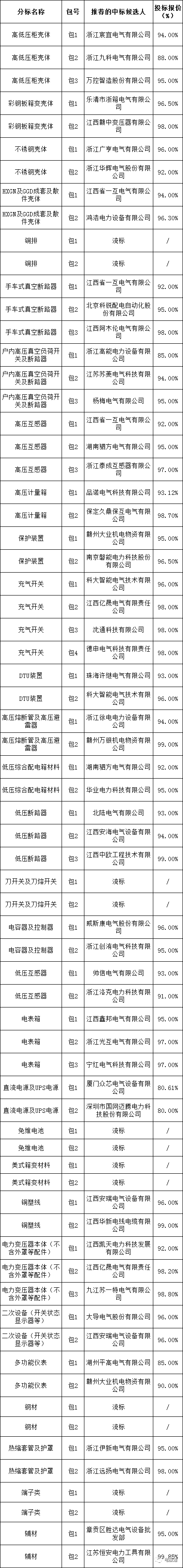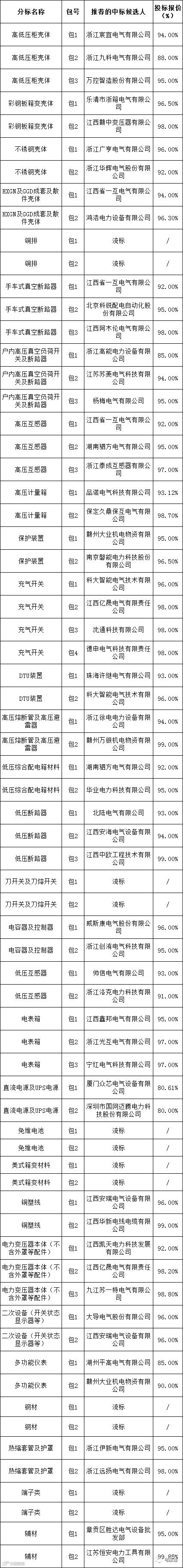 江西省虔安电力有限公司2023年第一批生产物料框架招标采购项目评标工作已经结束。依据对中标候选人公示的规定,现将评标委员会推荐的中标候选人予以公示,公示期3日。投标人或者其他利害关系人若对评标结果有异议的,请在中标候选人公示期间以书面形式(邮件)提出。