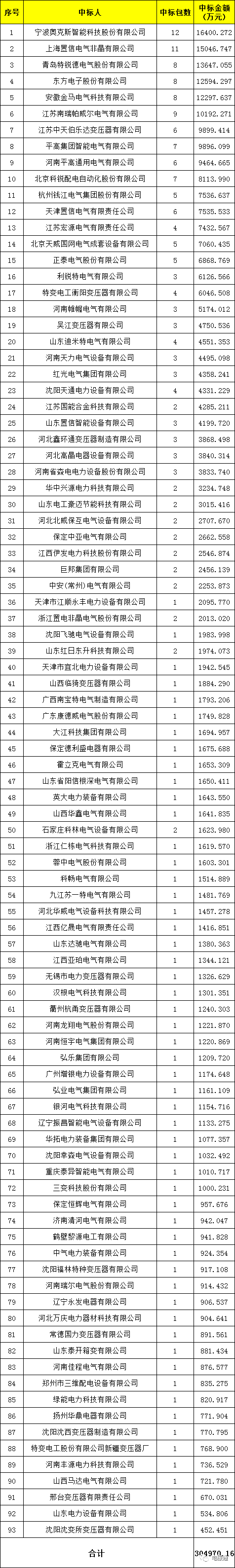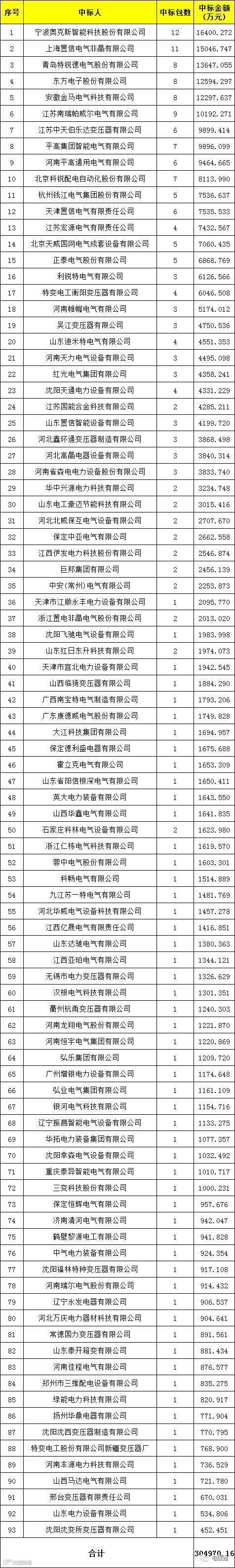 小编统计了各企业中标情况,中标的企业有93家,累计中标金额超过30亿元,其中宁波奥克斯智能科技股份有限公司中标金额超1.6亿元,详情如下: