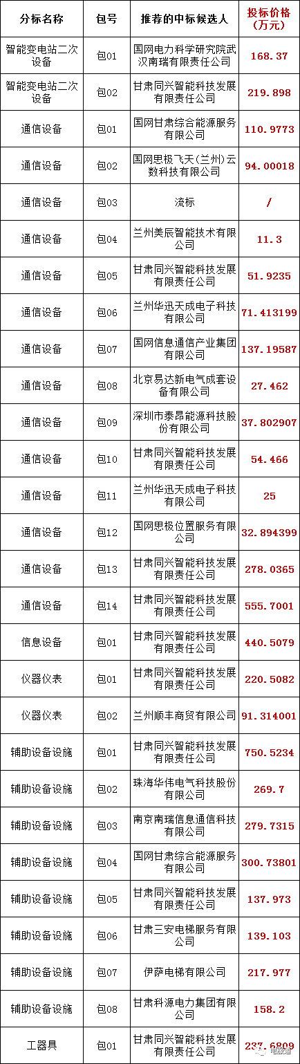 国网甘肃省电力公司2023年第三次物资公开招标采购项目评标工作已经结束,依据对中标候选人公示的规定,现将评标委员会推荐的中标候选人予以公示,公示期3日。投标人或者其他利害关系人若对评标结果有异议的,请在中标候选人公示期间以书面形式(电子邮件)提出。