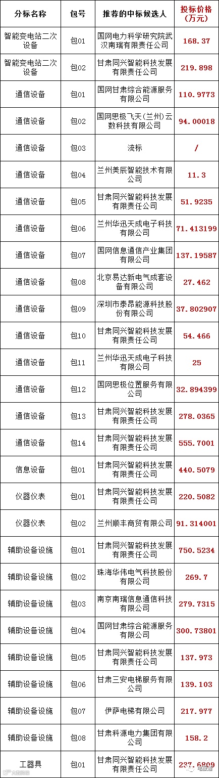 国网甘肃省电力公司2023年新增第三次物资公开招标采购评标工作已经结束,依据对中标候选人公示的规定,现将评标委员会推荐的中标候选人予以公示,公示期3日。投标人或者其他利害关系人若对评标结果有异议的,请在中标候选人公示期间以书面形式(传真)提出。