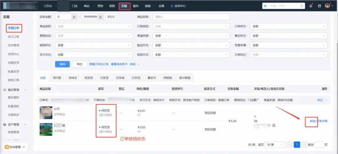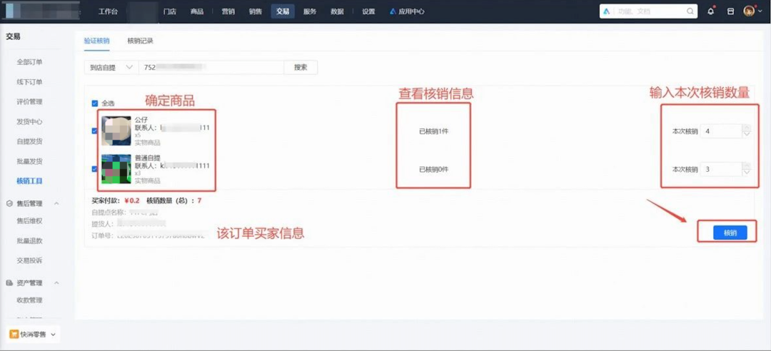商家可在订单中按实际到货情况,支持消费者通过自主核销、扫一扫核销、提货码或手机号核销四种方式,对单个或多个已到货商品进行单笔订单部分核销或多笔订单核销。订单核销增加商品及其数量选择,并在交易记录各个场景下展示其核销状态。