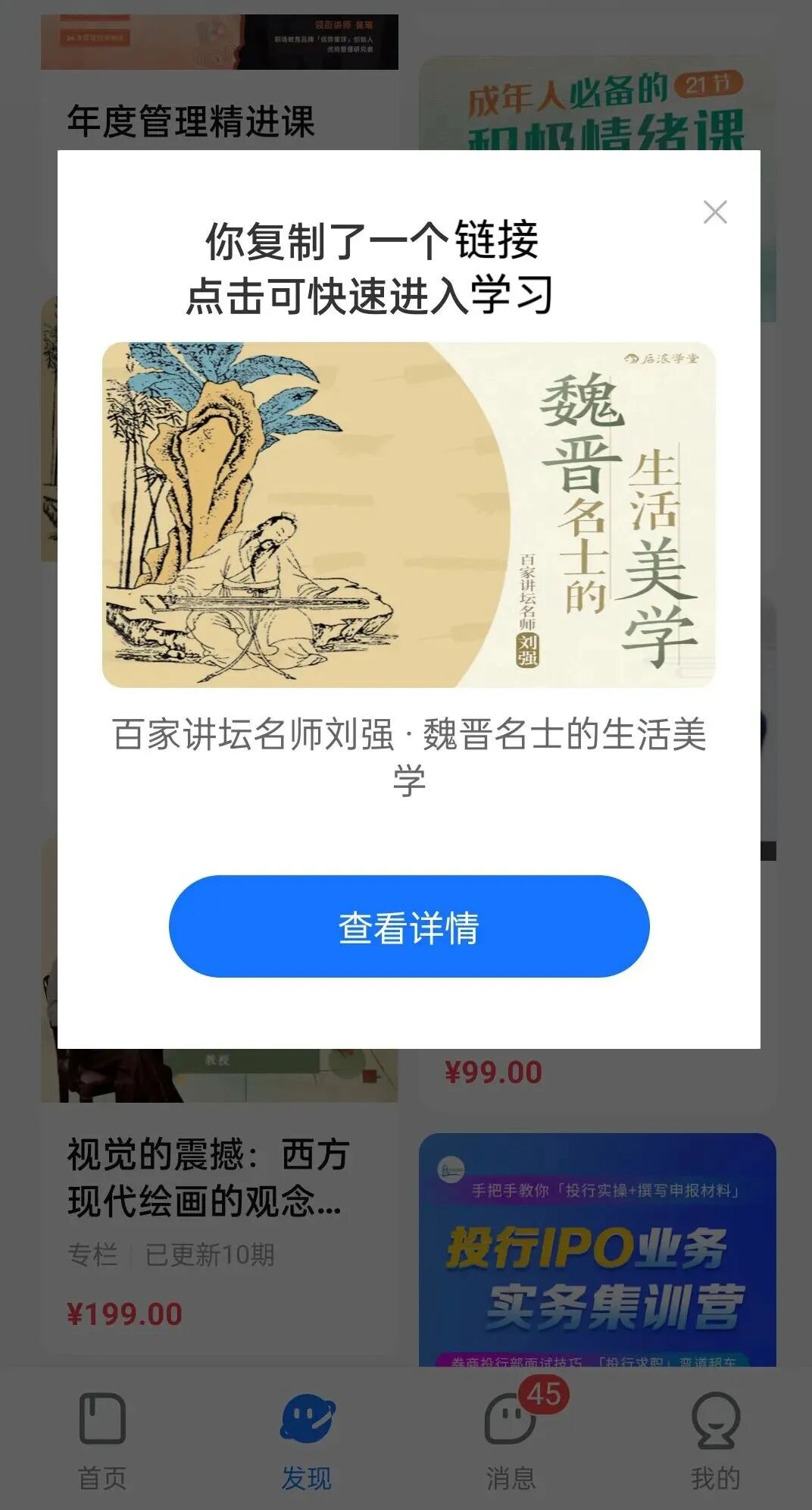 当用户复制培训链接后,打开即可触发自动识别,显示培训封面以及名称,点击查看详情后可一键直达对应培训页面,无需手动搜索、粘贴或输入名称。在搜索框中粘贴培训链接,点击搜索便可立即跳转至链接对应内容。