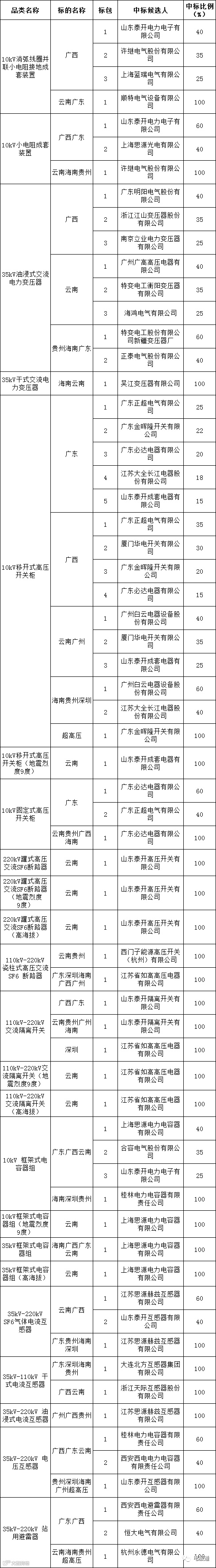 南方电网公司2023年主网一次设备第一批框架招标项目,经评标委员会评审,现将中标候选人公示如下: