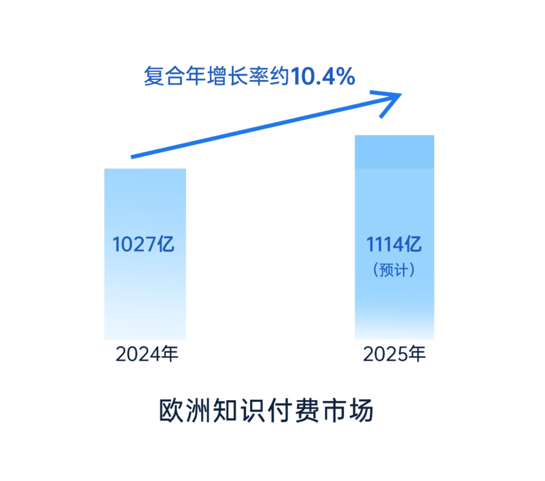 欧洲知识付费市场在2024年已达1027亿美元,预计2025年将突破1114亿欧元,预计复合年增长率约10.4%,显著高于传统信息内容类行业(数据源于marketdataforecast)。