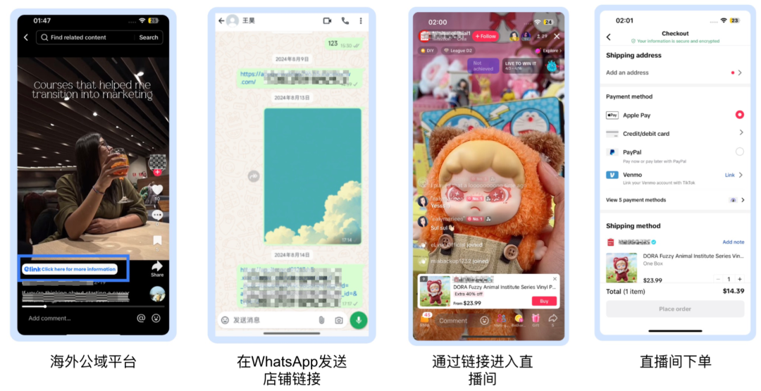 通过海外公域平台(如TikTok等)将粉丝引导至私域(如WhatsApp等),介绍课程内容并与用户进行互动,建立联系