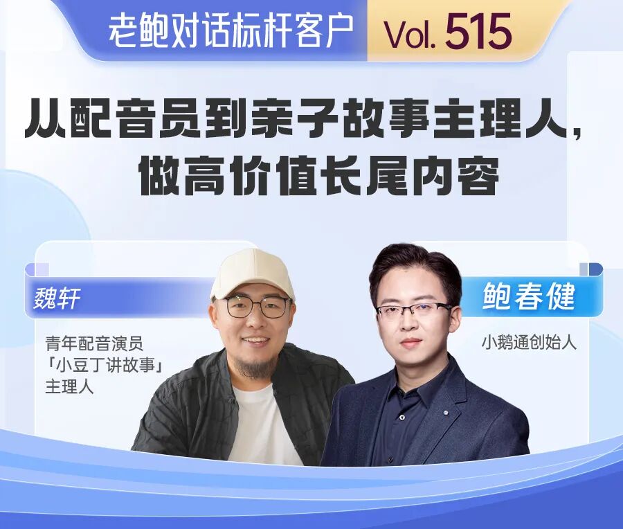 客户介绍:老鲍对话标杆第515期,邀请了青年配音演员、「小豆丁讲故事」主理人——魏轩老师