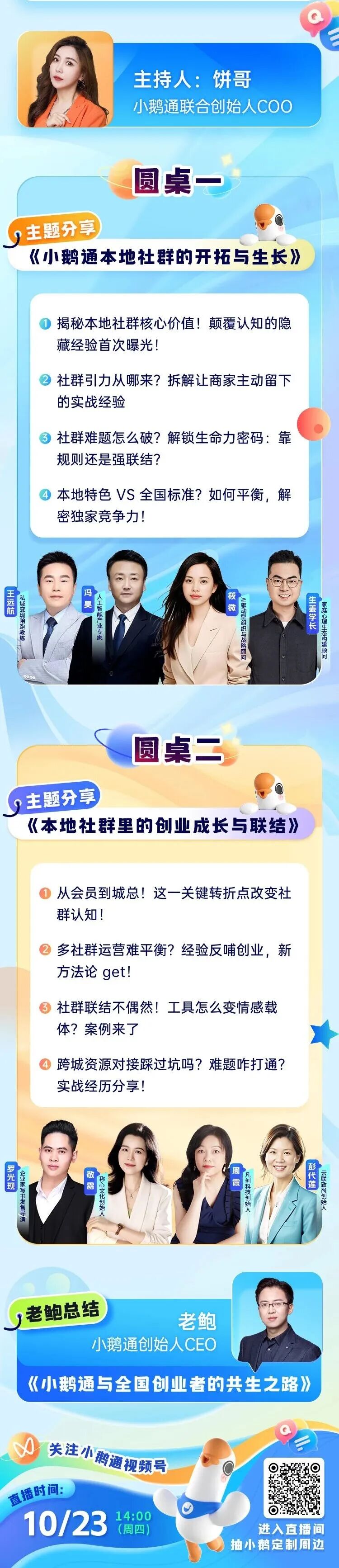 今天,我们特别邀请了8位城市总教练担任分享嘉宾,围绕 “社群引力” 展开两场主题圆桌与一场创始人深度分享,带你走进社群背后的真实故事与实战逻辑。以下是完整节目单,长按扫码即可进入直播间!