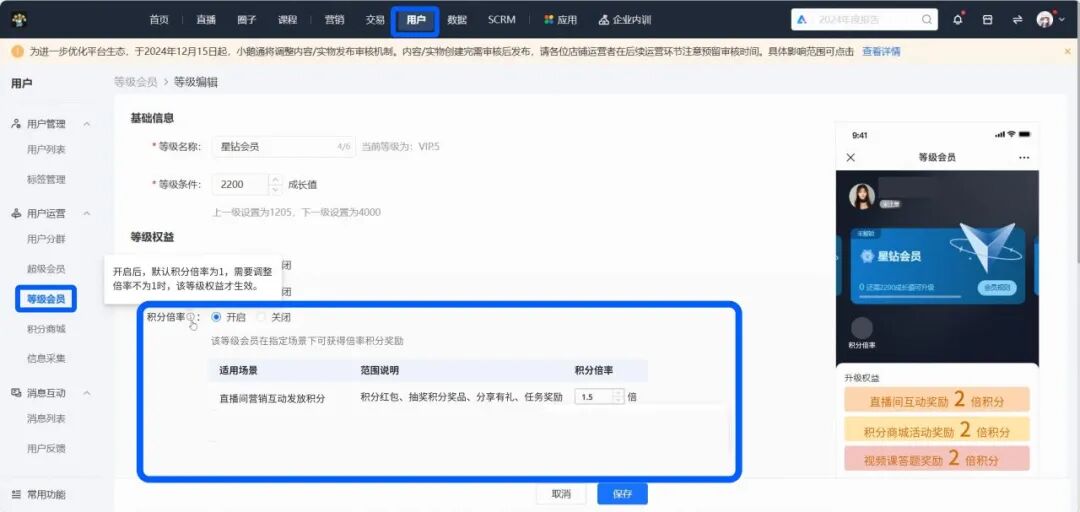 小鹅通重磅升级【等级会员】功能,推出「积分倍率」、「会员任务」新玩法,助您轻松实现用户分层精细化运营,以更高效、更低成本的方式打造会员体系!