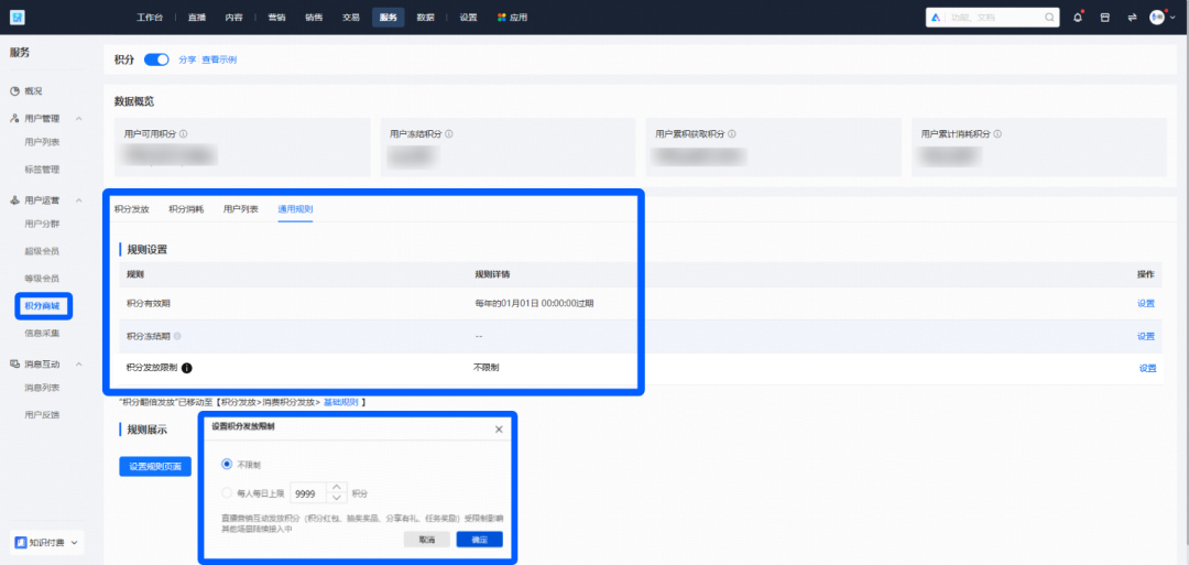 为了让商家朋友们更精准地掌控营销成本,避免积分滥用的情况,我们新增了设置积分发放上限规则。系统默认为“无上限”的状态,可以自定义设置每人每日的积分领取上限。