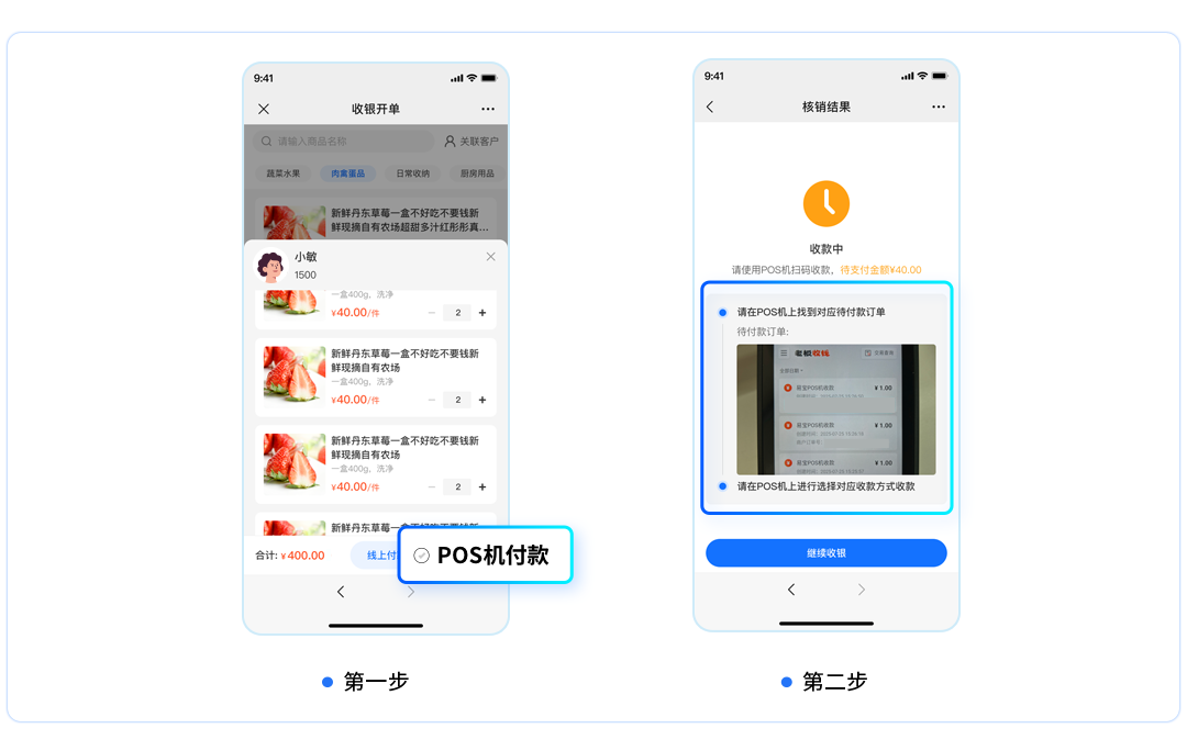 对于已开通POS机收银功能的门店,可选择POS收款。目前仅支持微信付款码,扫码后金额自动推送至POS终端,支付流程顺畅便捷。