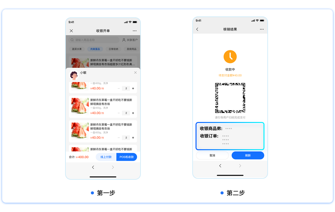 选择商品后,系统生成付款二维码,顾客扫码即可完成支付。适合大多数线下交易场景。