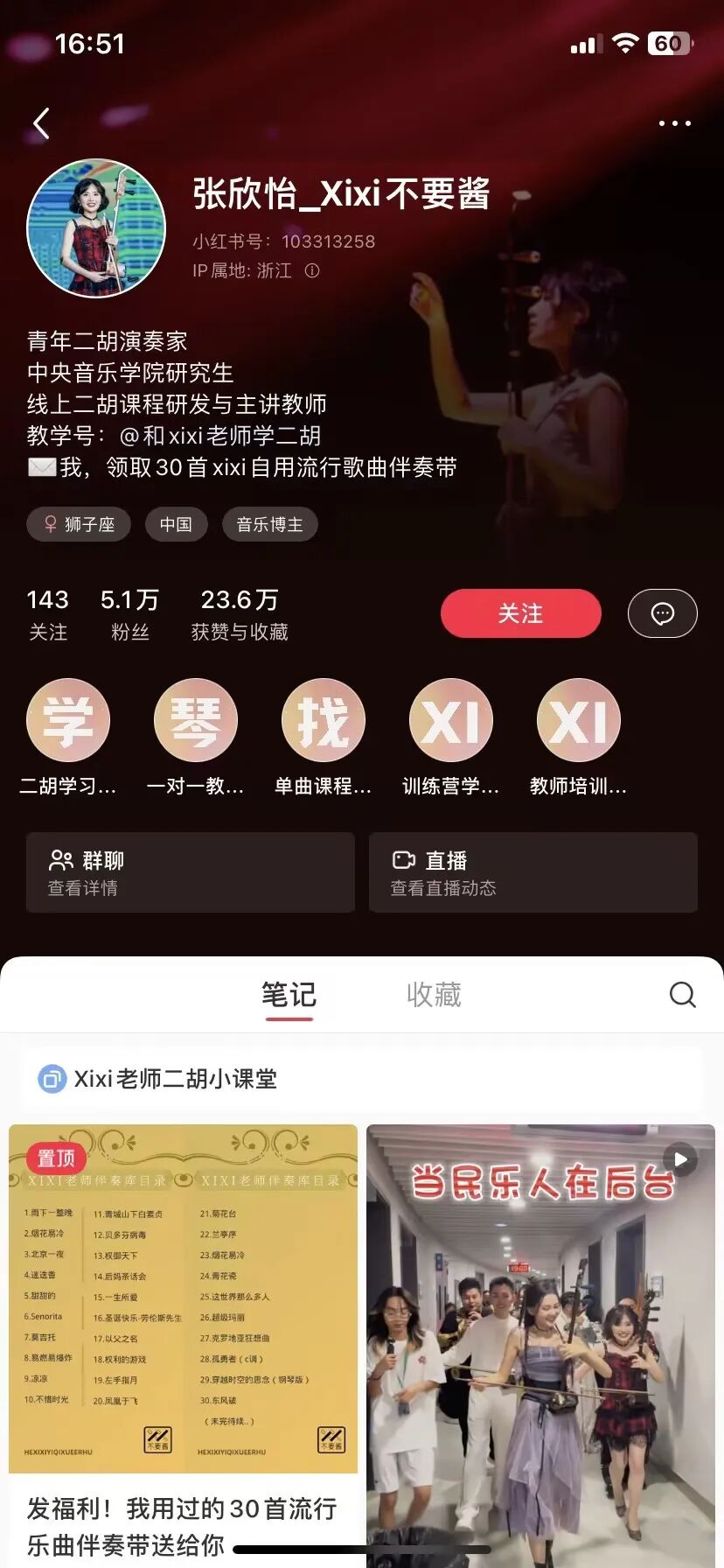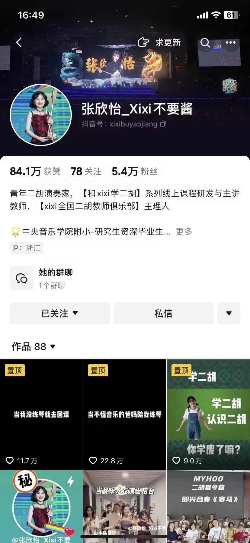 她在B站、抖音、小红书和视频号上都有账号,凭借解锁二胡的不同打开方式,成了全网30万粉丝的音乐博主。