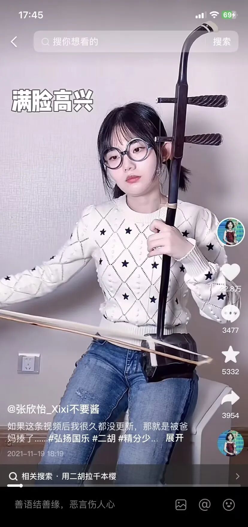 还通过二胡创意改编和各种情景短剧,打造出高辨识度的二胡IP,在网上吸引了精准粉丝。
