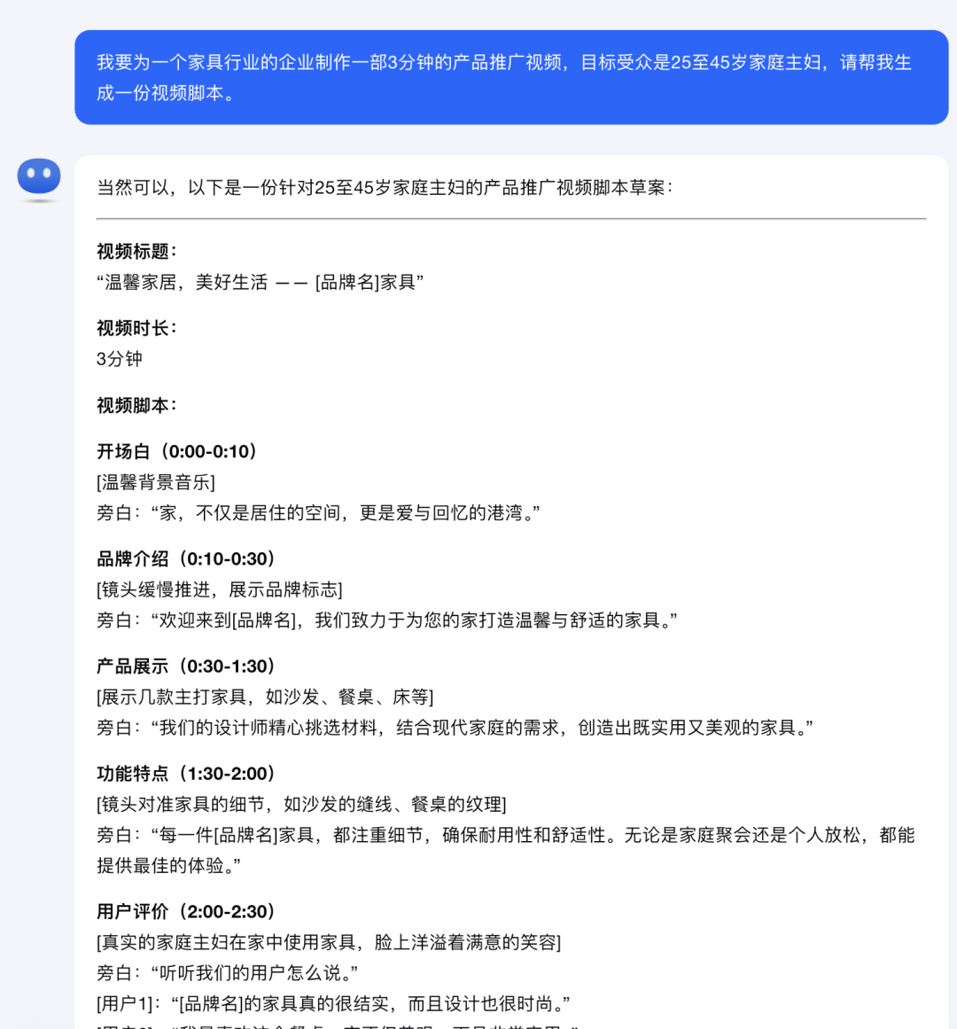 “我要为一个家具行业的企业制作一部3分钟的产品推广视频,目标受众是25至45岁家庭主妇。”