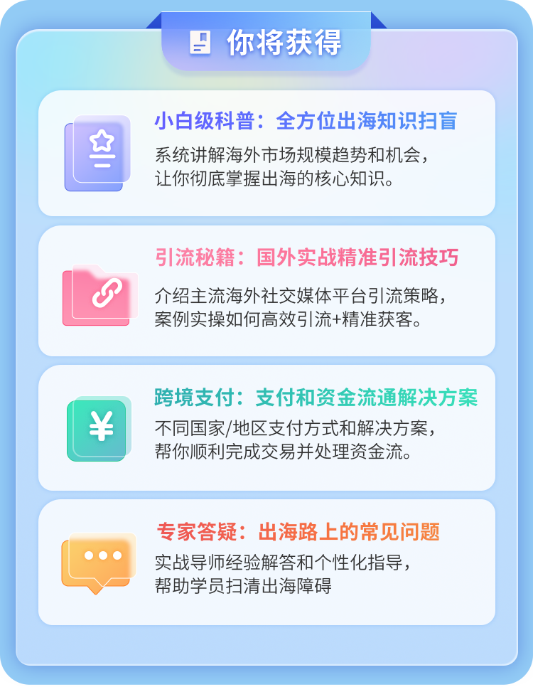 你将获得小白级科普扫盲、实用引流秘籍、跨境支付解决方案和链接资深玩家的机会,和玩转出海知识创业的先行者交个朋友!