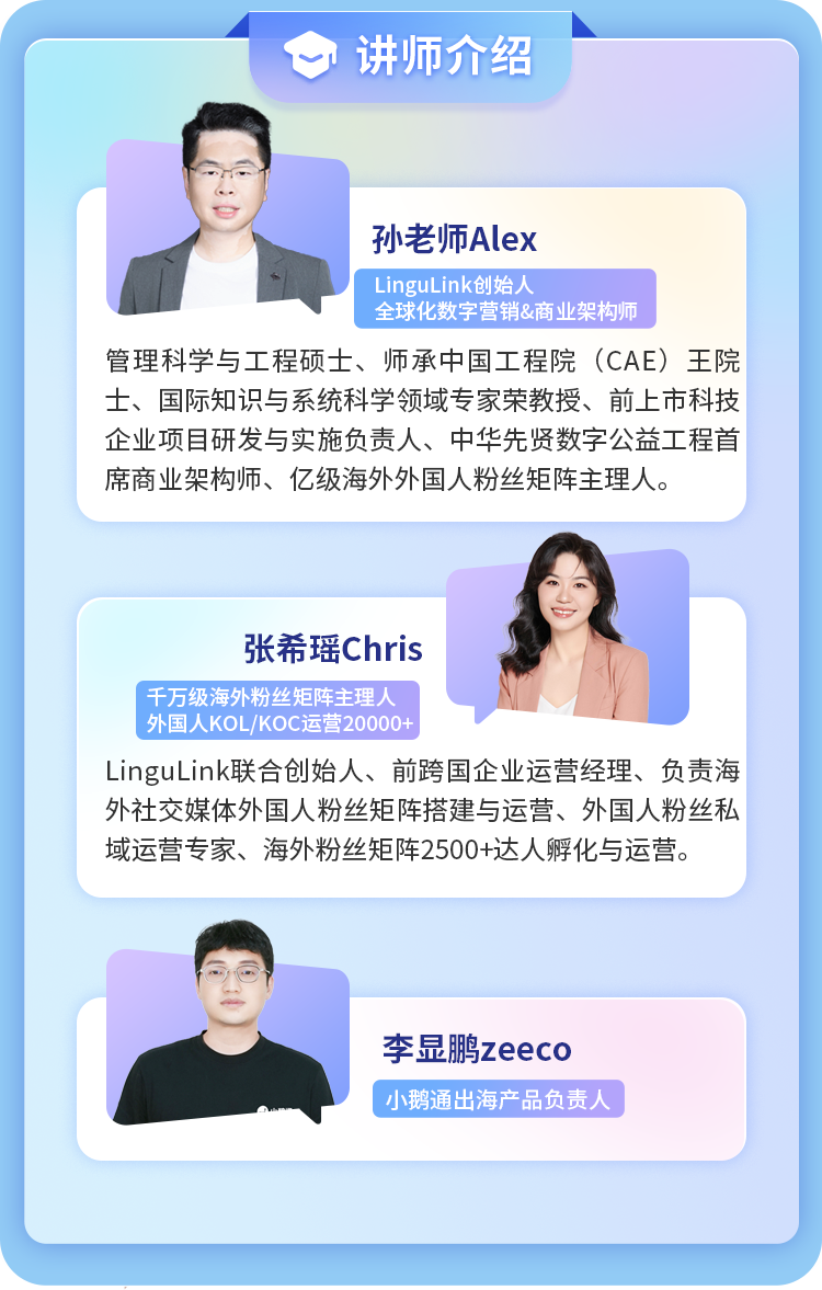 孙老师Alex,是LinguLink创始人、全球化数字营销&商业架构师。他还是管理科学与工程硕士、师承中国工程院(CAE)王院士、国际知识与系统科学领域专家荣教授、前上市科技企业项目研发与实施负责人、中华先贤数字公益工程首席商业架构师、亿级海外外国人粉丝矩阵主理人。