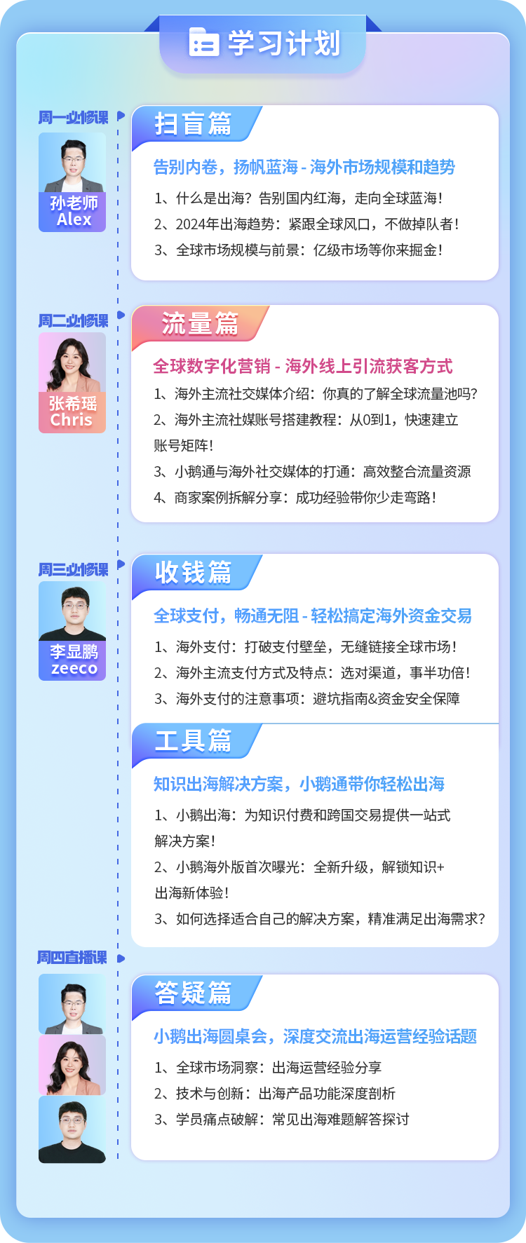 李显鹏zeeco,小鹅通出海产品负责人。他不但熟悉(小鹅通)产品逻辑,还十分擅长分场景使用产品工具,能帮助大家快速掌握出海产品的打造、课程支付问题。