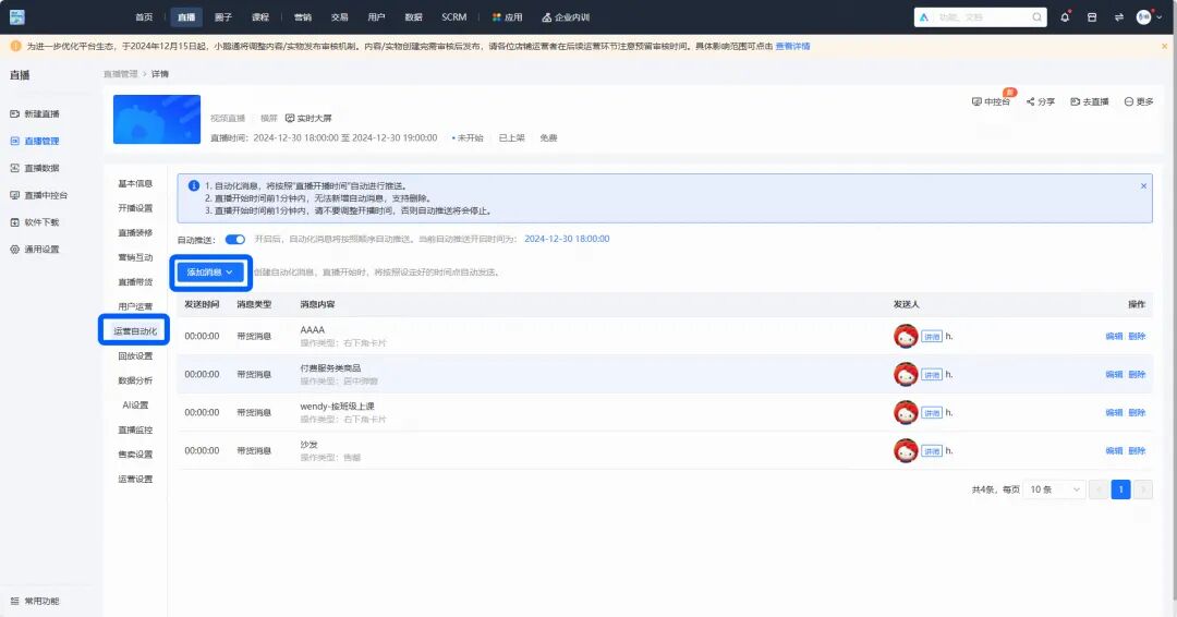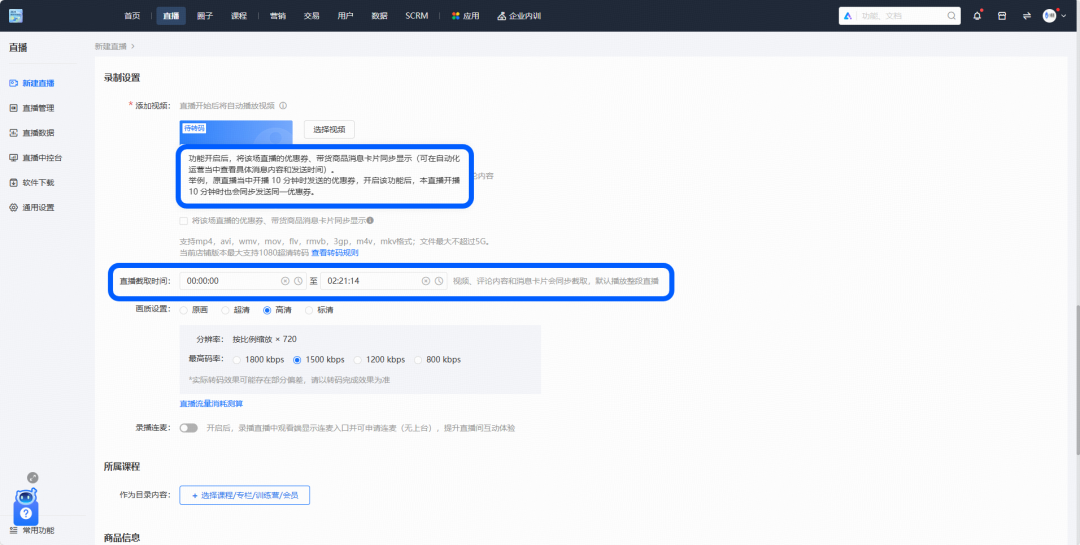 本次升级,录播的设置支持上线已有的优惠券、带货消息,并且可以开启同步显示的自动化功能。