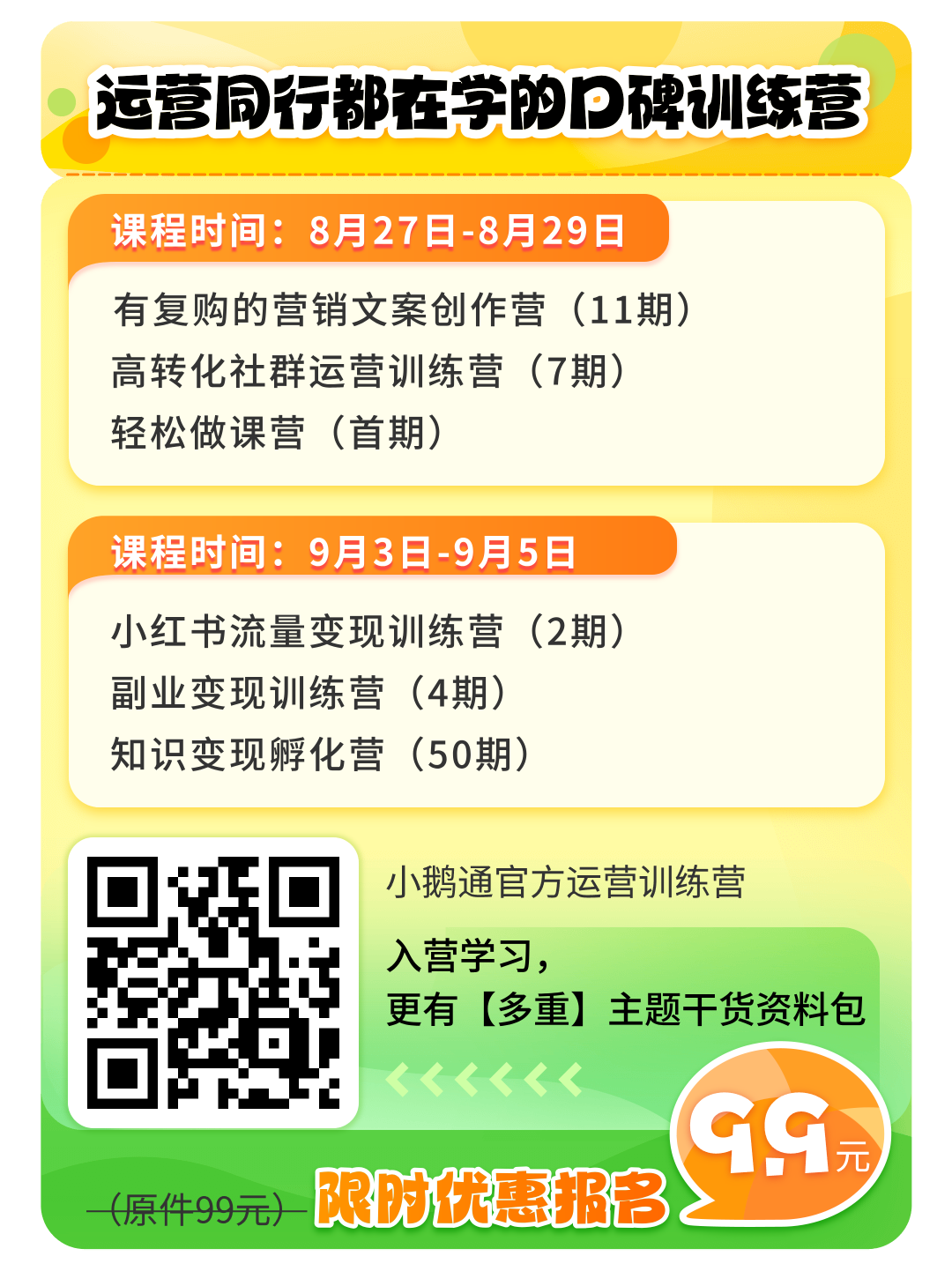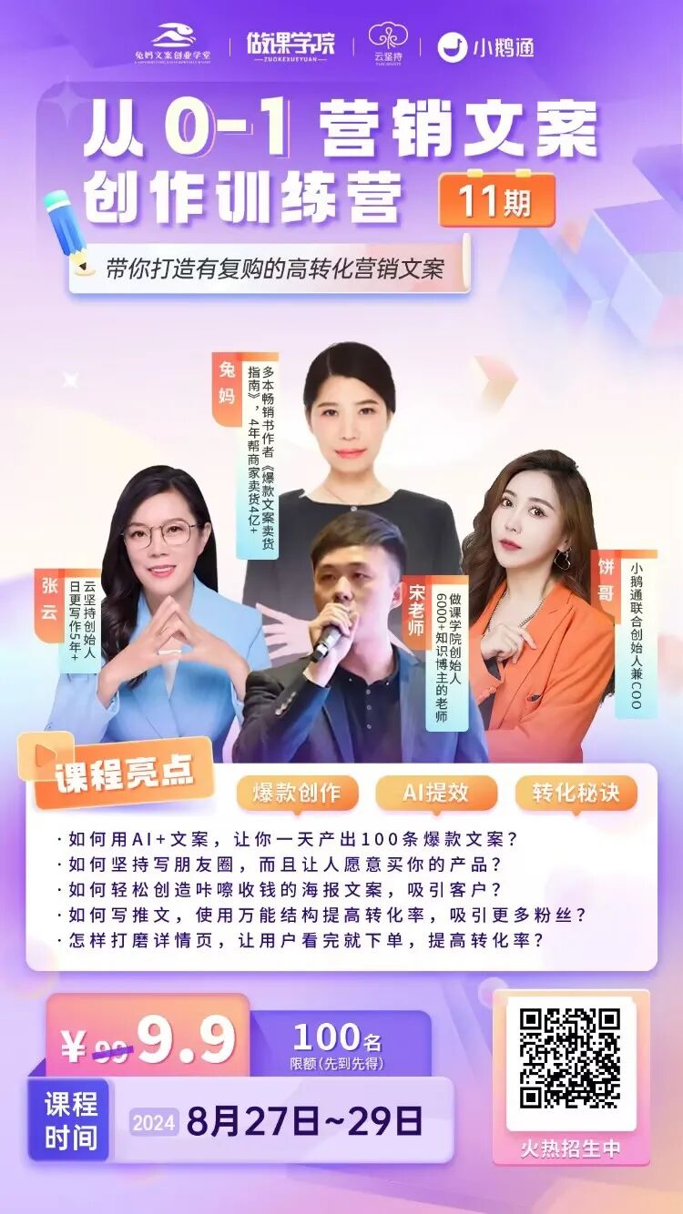 你是不是也缺乏文案写作心法,营销文案无从下手?不会表达产品亮点,无法吸引潜在用户?别担心,小鹅通11期「从0-1文案创业训练营」已启动,等你来!