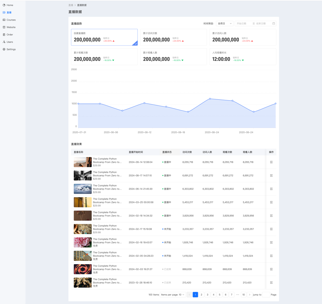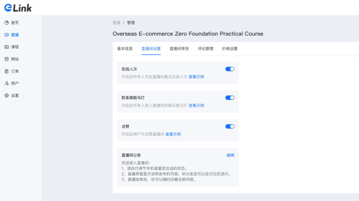 为了满足不同场景的直播需求,eLink平台支持创建实时直播与视频直播两种直播形式;同时支持免费直播和付费直播。此外,还支持在课程中创建直播小节,使课程更加丰富。