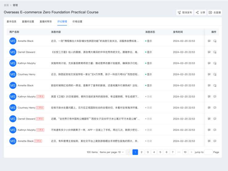 为了提升用户在直播间的参与度与活跃度,eLink支持评论管理、直播间在线人数展示、用户点赞等功能,实现主播与用户高效的双向互动,活跃直播间氛围。