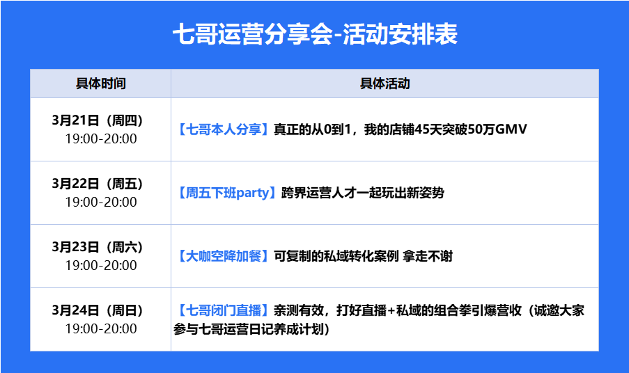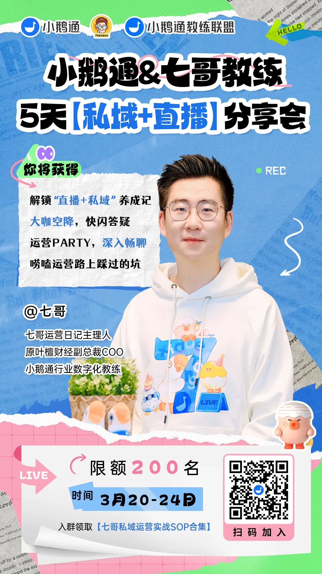 如果你也正在头疼“私域运营”的问题,如果你也想突破目前的业务瓶颈,我们和七哥一起为大家准备一场5天运营分享会,3月20日至24日限额200人免费进群!