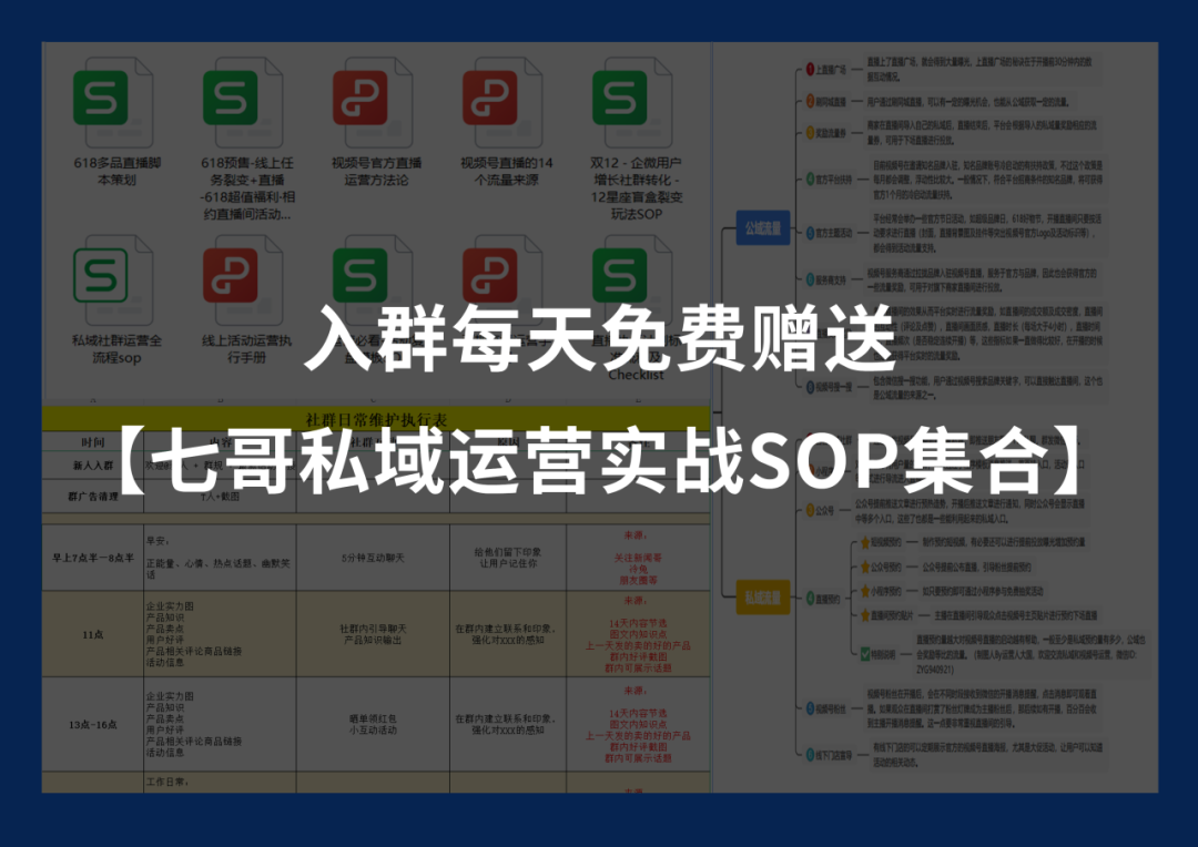 欢迎所有正在内容创业的朋友,进群参加运营分享会,直接和七哥聊聊“私域+直播”的业务难点,拿到系统的【私域运营SOP合集】干货。