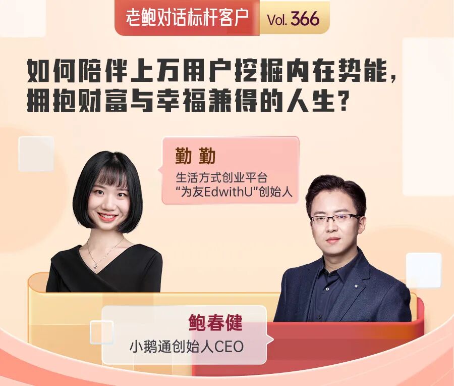 客户介绍:老鲍对话标杆第366期,邀请了生活方式创业平台“为友EdwithU”创始人——勤勤。她既是国际教练联盟认证中的生命教练 (life coach),深耕职业成长5+年,累计学员1000+,把热爱做成副业,把副业做成创业,变现7位数,还是一位跨时区工作的数字游民,理想生活实践者。