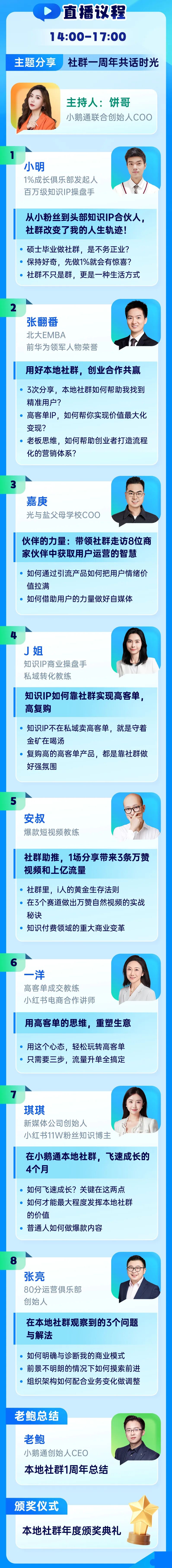 本次直播,我们邀请了8位小鹅通本地社群的城市代表担任分享嘉宾,他们不但有自媒体起号、个人IP打造、社群运营、企业陪跑方面的实战经验,还有知识创业层面的独家心得。