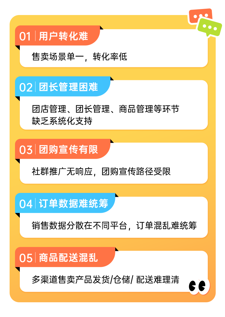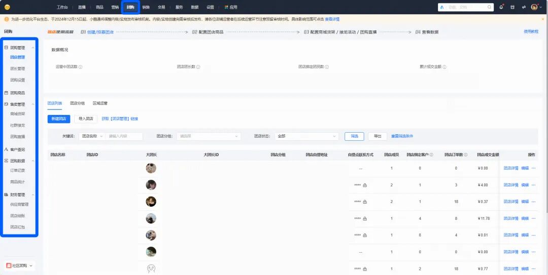 在团购活动进行的前、中、后期,团店、团长的管理与设置,商品管理、售卖场景、数据统计、客户管理、财务管理等一系列完整流程,可以一键在【团购】模块下完成,提供一站式管理解决方案。