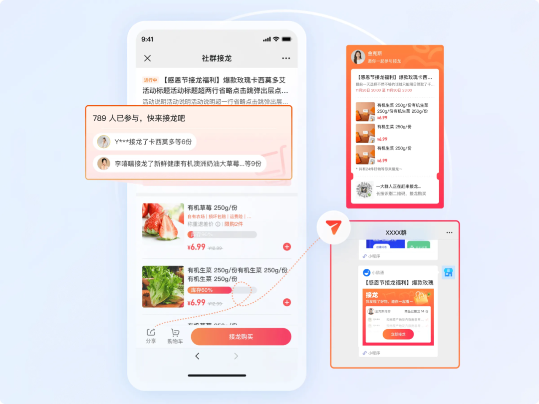 实时展示商品库存和接龙进度,营造抢购氛围,刺激消费欲望,增强社群互动性,提升用户粘性。社交渠道快速传播裂变,实现低成本高效裂变推广。灵活适用多场景,满足不同活动需求