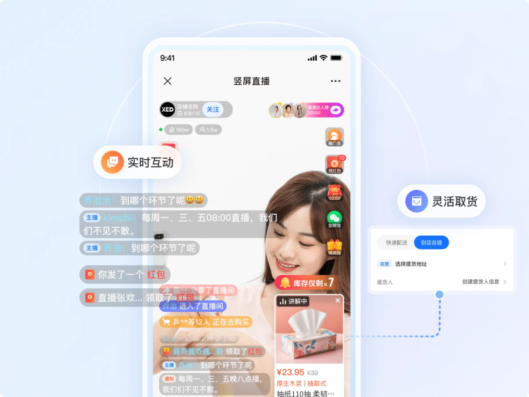 线上对商品进行展示售卖,可以让用户选择线下自提、落地配、快递等方式,提升购物便利性。实时的商品卡片链接,引导用户下单购买。