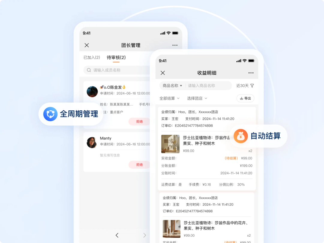 统计团长行为与业绩数据,灵活设置分佣与奖励机制,提升团长积极性与忠诚度。团长佣金支持自动结算,无需人工介入,提高结算效率,交易账目一目了然👁。