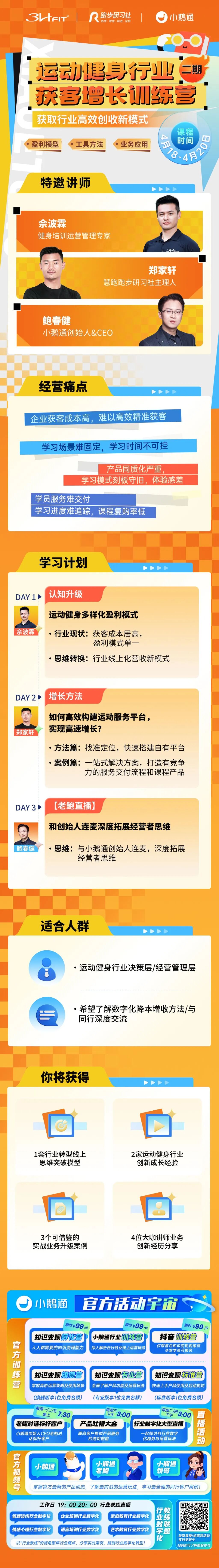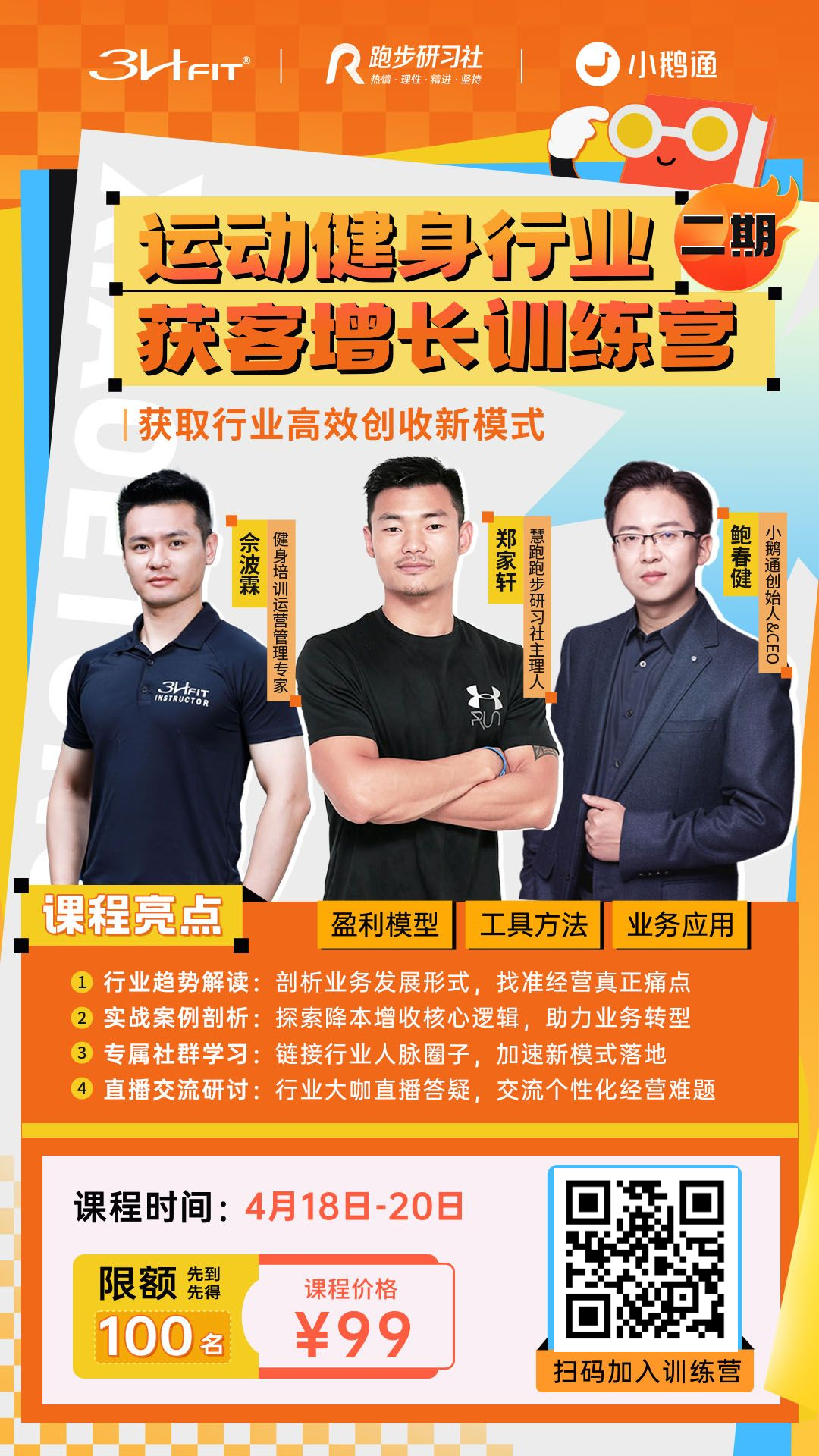 现在,我们结合小鹅通许多优秀的运动健身行业客户案例,还有多名头部IP访谈调研,特别定制了「运动健身行业获客增长训练营」。