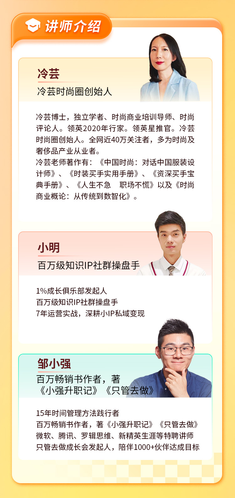 同时,大家还可以链接目前已经拿到结果的3位知识大咖,他们也都是小鹅通教练联盟的教练,将会从“社群设计技巧”、“解决运营难点”、“一套转化打法”、“实战案例拆解”等4大方向,传授多年来社群运营经验和持续变现秘籍,帮你找到“社群运营”从0到1、持续成交的运营心法。