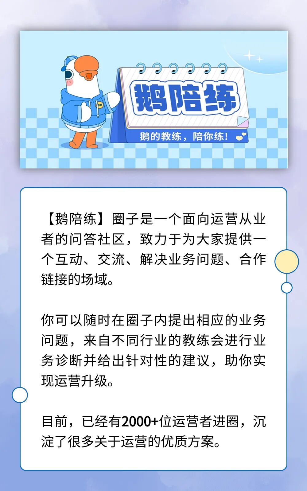 好了,以上就是本周的运营陪练,如果你还想了解更多运营相关的话题,或者也有急需解决的运营难点,和公私域运营玩法!可以免费进入【鹅陪练】圈子找对标行业的教练进行提问,现在不但能免费获取教练分享的干货PDF,还能在“教练秘笈”获取更多的直播和干货课件,说不定你能找到更多有效解题方案。