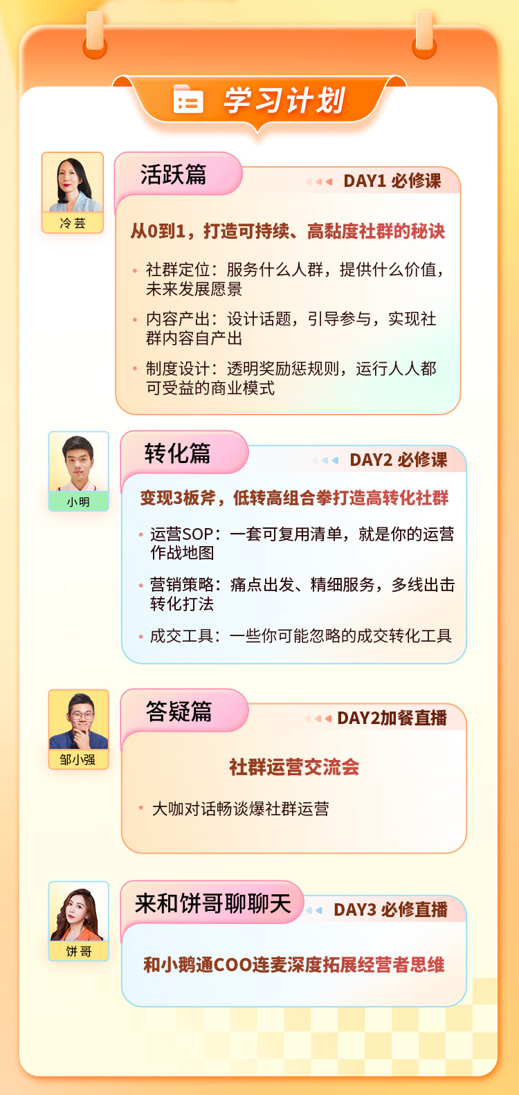 现在第三期也开始火热开启,我们准备了3天的社群运营实用入门课程和专属社群交流,手把手帮助大家快速上手社群运营。这一周还可以享受拼团福利活动噢!点击下方海报即可参与活动,原价99,目前拼团仅需3.3。限时限量,快拉好友一起享受专属特惠:
